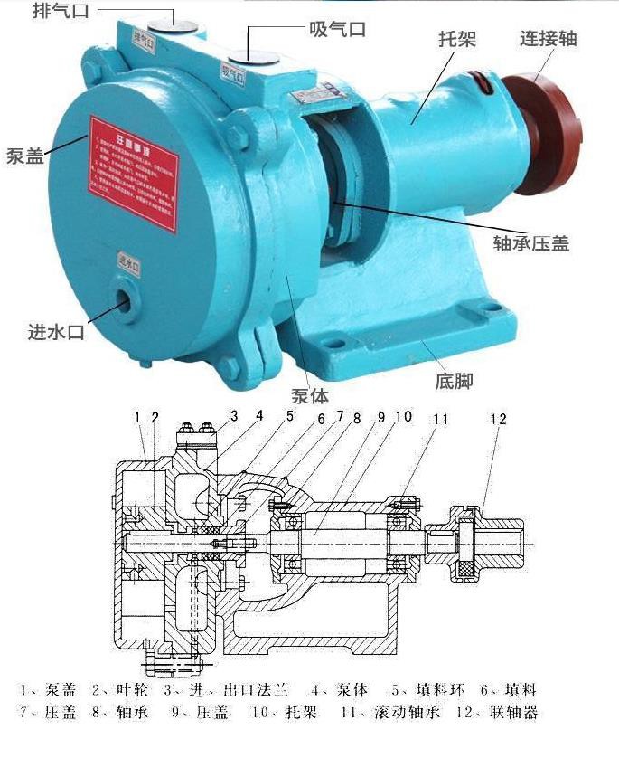 SZB懸臂式水環真空泵工作室由泵體、泵蓋構成,上有進排氣口,下有放水塞,泵蓋上有指示旋轉方向的箭頭,泵體有填料函和填料壓蓋,內裝填料密封,泵體側面的螺絲孔為補充水環消耗用水。由鑄鐵制成葉輪,有12個葉片呈放射狀均分布,有平衡孔(其中兩個套扣供拆卸用)平衡軸向力。葉輪平鍵與軸聯接并可沿軸向滑動調節間隙。軸為鋼制成,支承在泵的托架內的兩個滾珠軸承上,右端有彈性聯軸器和電機直接聯接。托架用鑄鐵制成,有止口保證與泵體聯接,軸承間有空腔,可存潤滑油,用稀油或齒油滑均可。從傳動方向看,泵軸為逆時針方向旋轉(右邊法蘭為排氣口,左邊法蘭為進